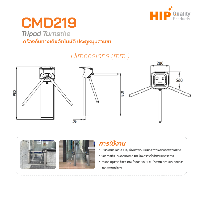 HIP เครื่องกั้นสามขา CMD219 เป็นระบบควบคุมช่องทางเดินอัตโนมัติที่ออกแบบมาเพื่อรองรับการใช้งานทั้งภายในและภายนอกอาคาร (เมื่อติดตั้งร่วมกับหลังคา) โครงสร้างแข็งแรงผลิตจากสแตนเลสเกรด 304 ทนทานต่อสภาพแวดล้อม พร้อมระบบมอเตอร์ขับเคลื่อน 24VDC ให้การเปิด-ปิดที่ราบรื่น รองรับการควบคุมการผ่านด้วยระบบ Access Control หลากหลาย เช่น สแกนใบหน้า สแกนลายนิ้วมือ ทาบบัตร หรือ QR Code มีไฟ LED แสดงสถานะการผ่านอย่างชัดเจน และสามารถตั้งค่าทิศทางการเข้า-ออกได้ทั้งแบบทางเดียวหรือสองทาง จึงเหมาะสำหรับใช้งานในฟิตเนส จุดตรวจตั๋วนิทรรศการ ทางเข้าออกของอาคารสำนักงาน ชุมชน โรงงาน และสถาบันต่าง ๆ เพิ่มความปลอดภัยและความสะดวกในการจัดการการผ่านเข้าออกได้อย่างมีประสิทธิภาพ